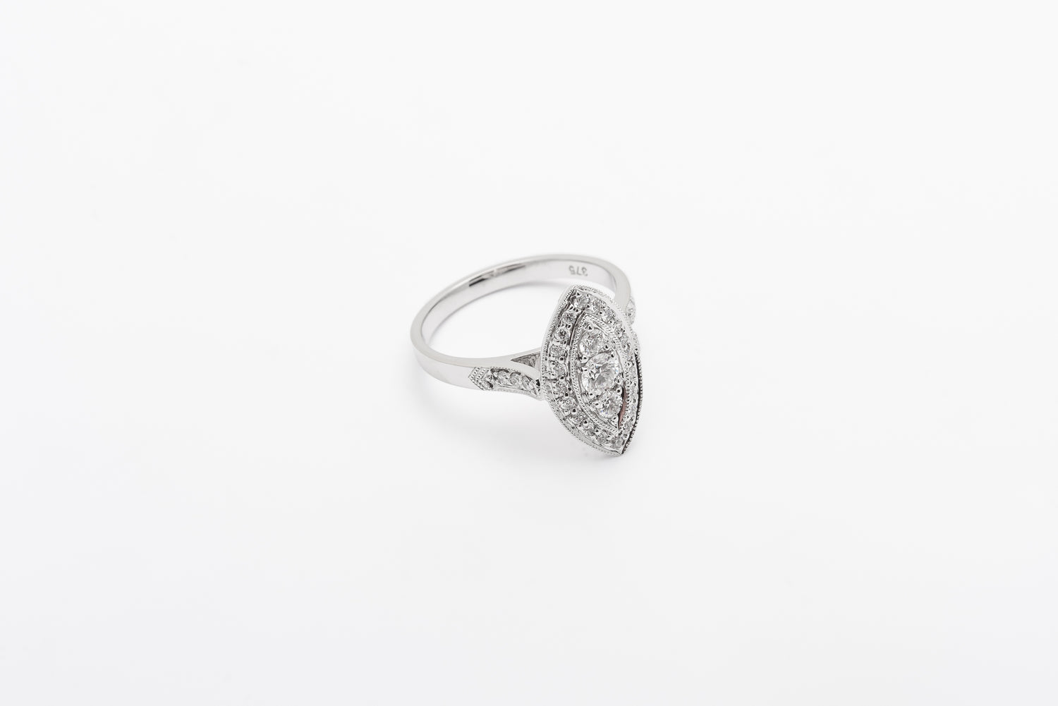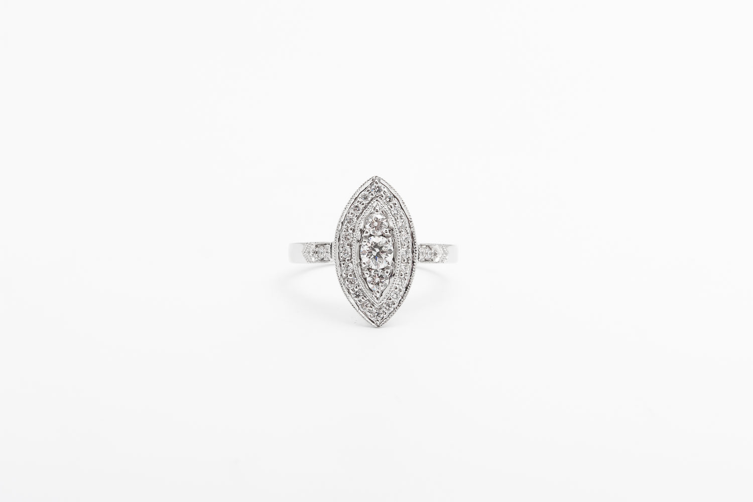 A beautiful arrangement of round brilliant cut diamonds in a marquise shape